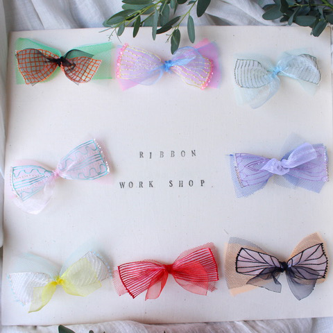 オリジナルで刺繍したオーガンジーとチュールを組み合わせて作るリボンのワークショップ。最後にヘアピンかゴムを選んで仕上げます。