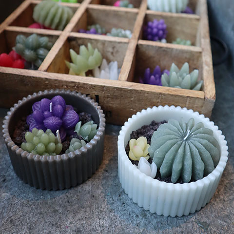 キャンドルの素材でできたカラフルな器と多肉植物のパーツを選んで、オリジナルのキャンドルをお作りいただきます。