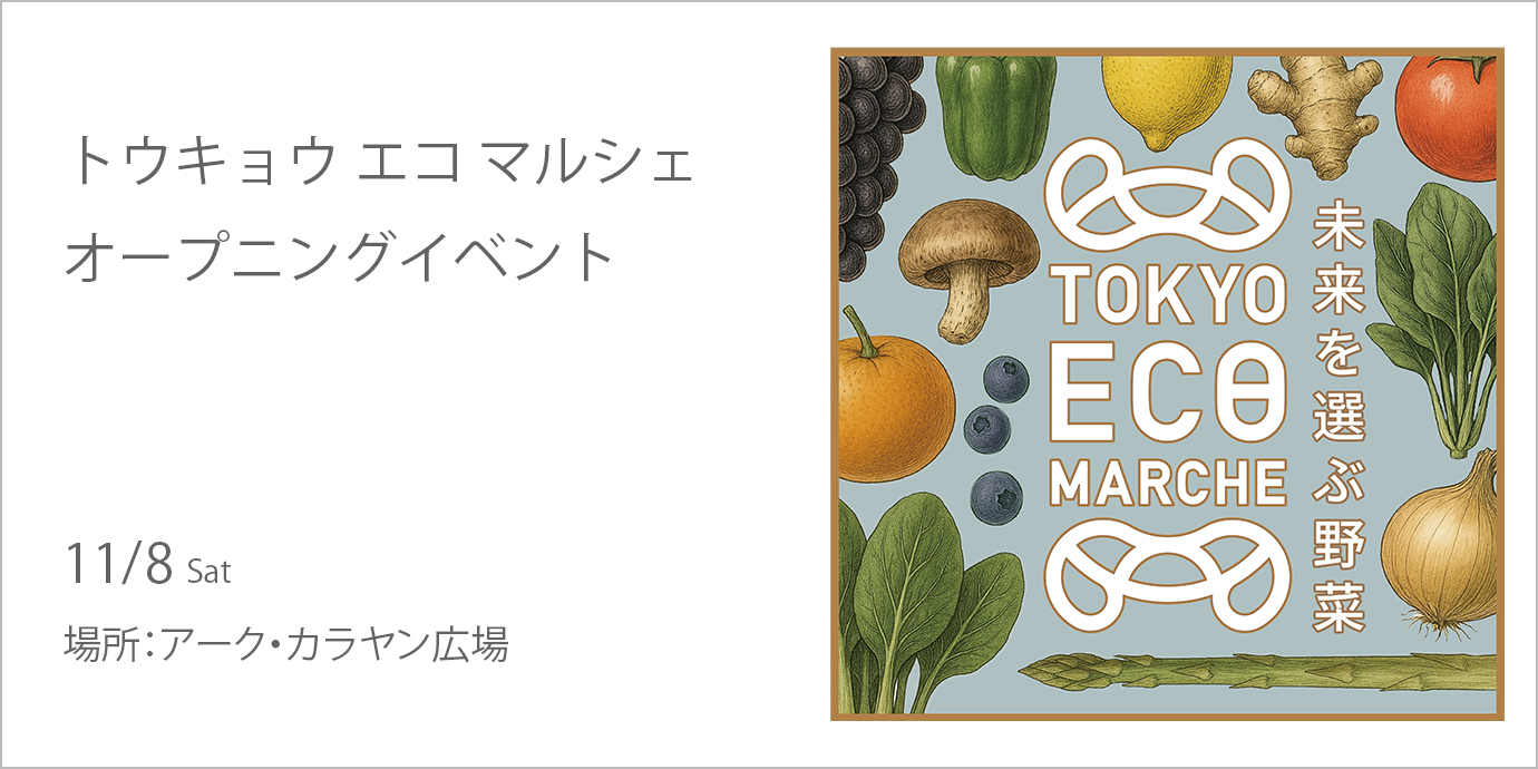 東京都内で化学合成農薬と化学肥料を削減して作られている「エコ農産物」。エコ農産物を販売する専門店「トウキョウ エコ マルシェ」が期間限定オープンいたします。そのオープンを記念しアーク・カラヤン広場にてイベントを開催!トークセッションやエコ農産物の販売、キッチンカーによるメニュー販売をいたします。