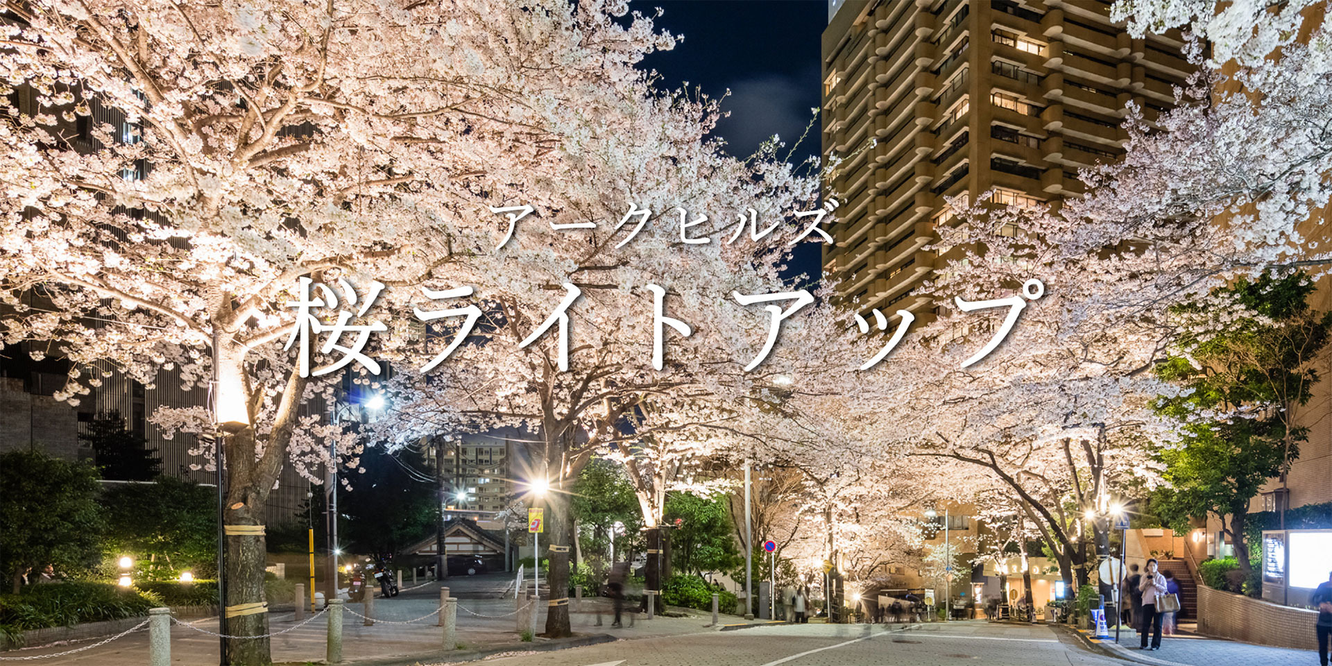 全長約1kmにもおよぶアークヒルズ周辺エリアの見事な桜並木を、開花期間中限定でライトアップします。柔らかく美しい光の演出の中に浮かび上がる幻想的な雰囲気に包まれた夜桜の光景はとてもロマンティックです。日差しと共に楽しむ昼間のお花見とは全く違った表情を見せる、夜のお花見をお楽しみください。
